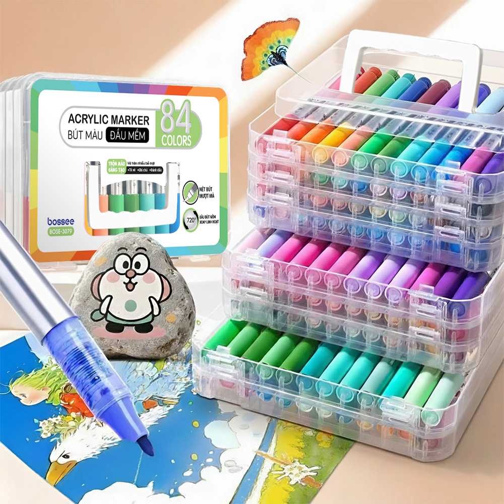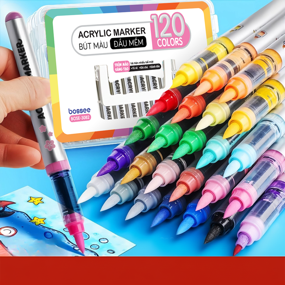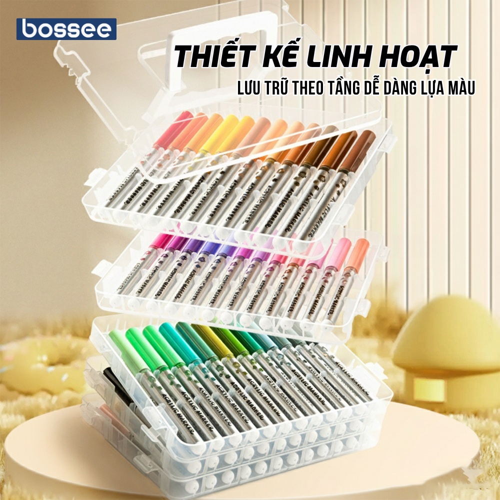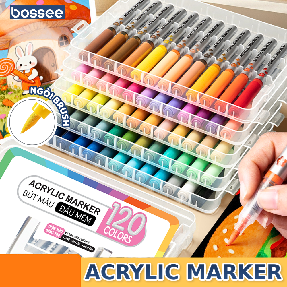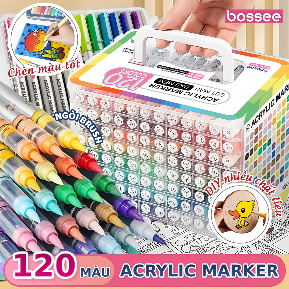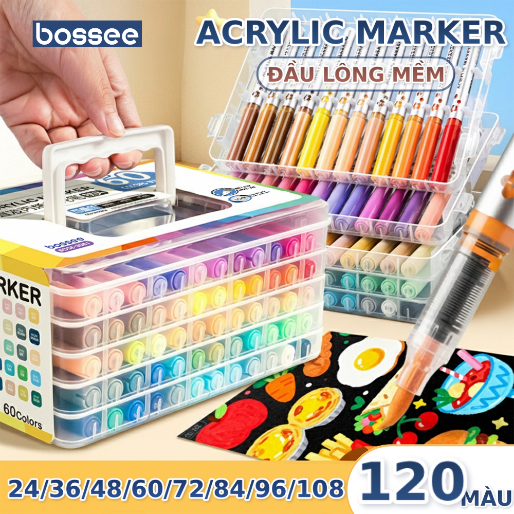 Bộ 120 Bút Sơn Acrylic Marker Cao Cấp Bossee, Bút Màu Acrylic Marker Đầu Brush – Tô Vẽ Mọi Chất Liệu Chống Nước – Bộ 24/36/48/60/72/84/96/108/120 Màu Đầu Lông Mềm Chèn Màu Tốt Bullet Journal, DIY An Toàn Cho Bé – Hộp Đựng Tầng Cao Cấp