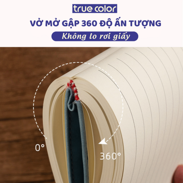 -Sổ tay ghi chép có thể mở góc rộng 180 độ, 360 độ mà không tạo ra nếp gấp hay vướng tay. Gáy sổ dán khâu chắc chắn, không bong tróc.